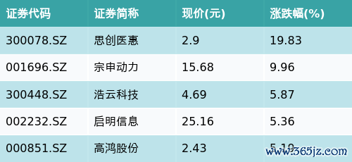 截至收盘专业股票配资官网,华为概念主题涨跌幅最高的五只股票为:思创医惠(300078.SZ)、宗申动力(001696.SZ)、浩云科技(300448.SZ)、启明信息(002232.SZ)与高鸿股份(000851.SZ)。详情见下表: