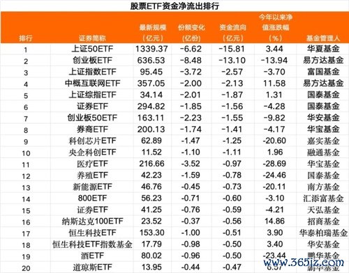 周二当天,部分股票ETF净流出较多,10只超过1亿元,上证50ETF、创业板ETF净流出居前。