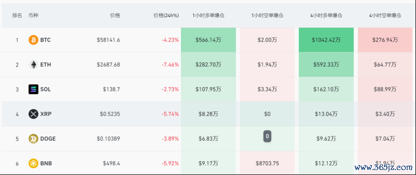 虚拟货币亦全线杀跌,比特币已经跌至58000美元/枚附近,以太坊跌幅超过7%。最近24小时,共有109527 人被爆仓 ,爆仓总金额为3.60亿美元。