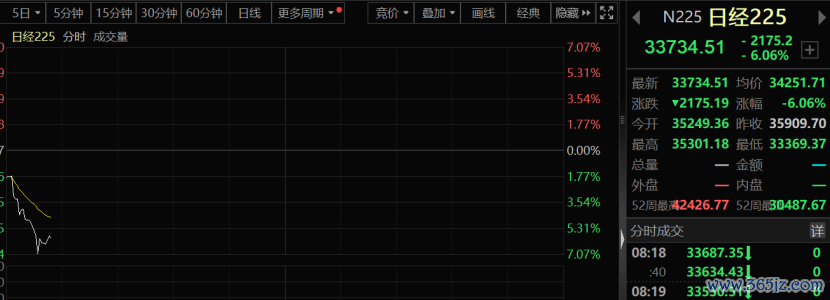 刚刚,日本股市出现史诗级暴跌,日经225指数狂泻近7%,日本东证指数触发熔断机制,并创下八年来最大单日跌幅。并带动韩国股市出现超4%的暴跌。与此同时,美元兑日元亦是狂跌,目前跌至145左右。日本5年期国债收益率亦下行10个基点至0.475%。